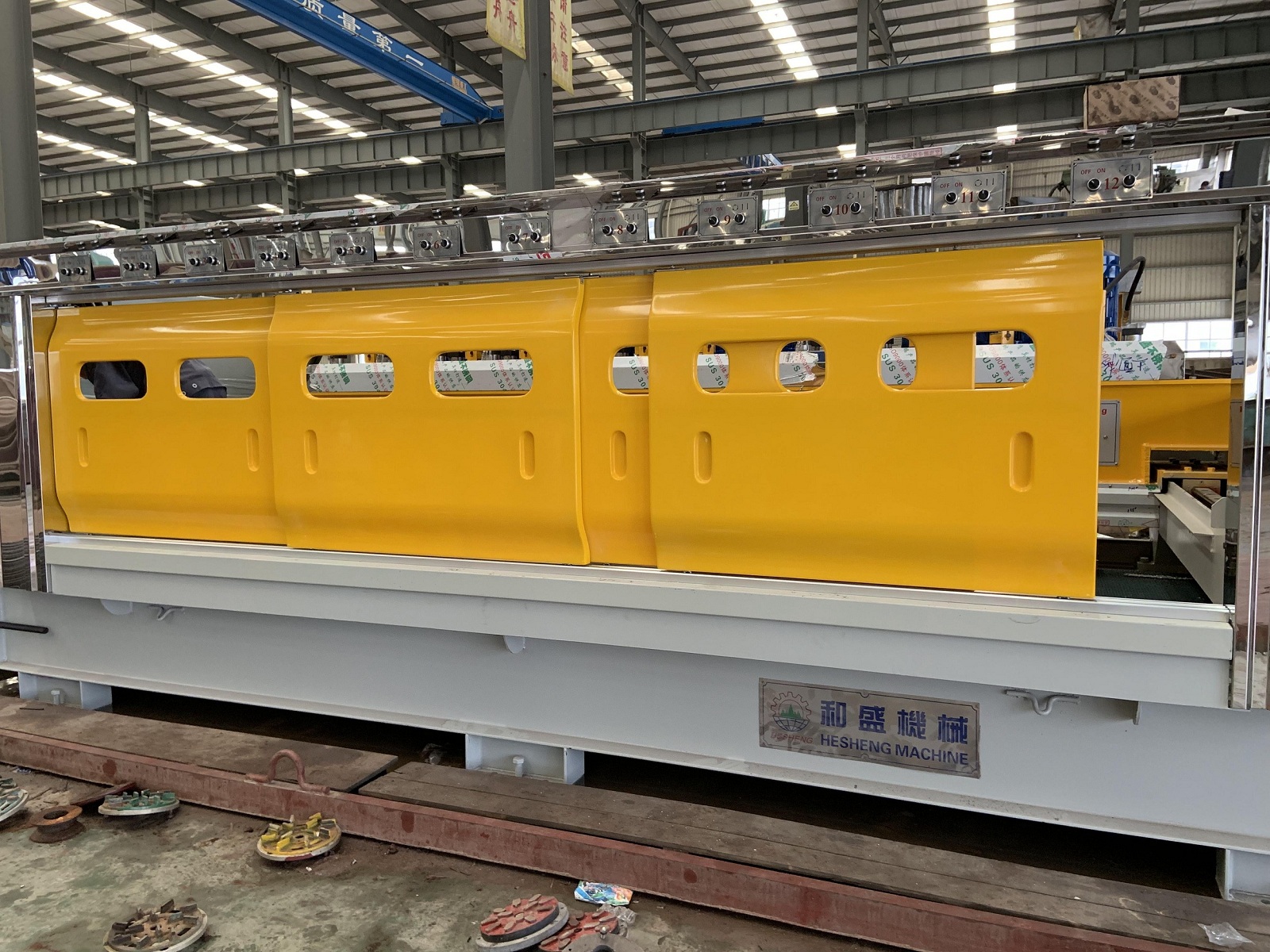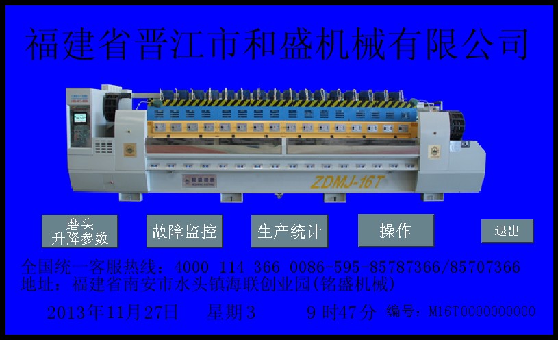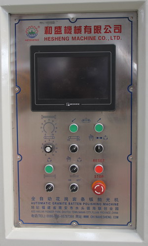 ? ??3.該機控制系統采用PLC終端控制,以液晶顯示觸摸屏終端為人機界面進行參數設定,設備運行過程中設有故障提示等等。該機適用于花崗石條板的連續磨削及拋光。板材輸送帶、磨盤橫移梁的工作速度均為變頻器調速;磨盤工作壓力、板材的磨削寬度在設定值范圍內可調。本機可對板材形狀自動識別,每個磨盤(磨頭)可根據識別板材的形狀自動升降,同時對板材磨削進行跟蹤記錄。整機均按標準化生產,性能穩定、故障率低等優點。